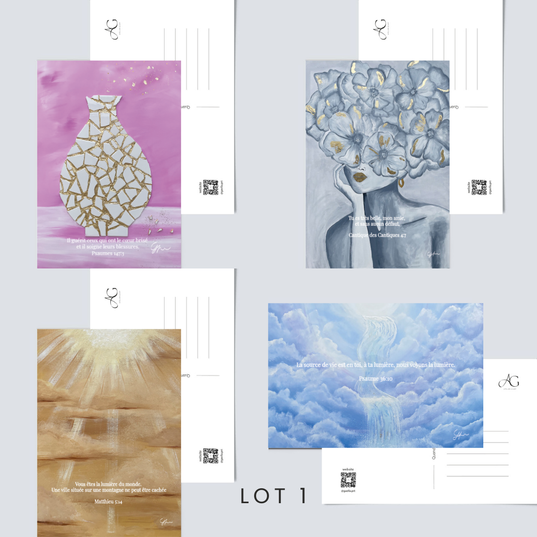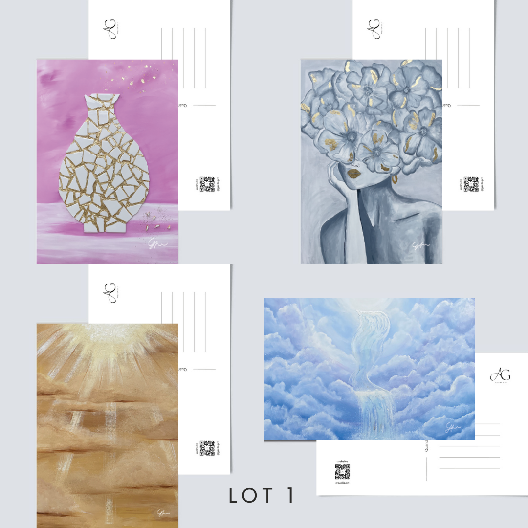 Un ensemble de 4 cartes postales imprimées sur un papier 300g, capturant l’essence de mes peintures. Format 10,5 x 14,8 cm, parfait pour écrire, collectionner ou encadrer.